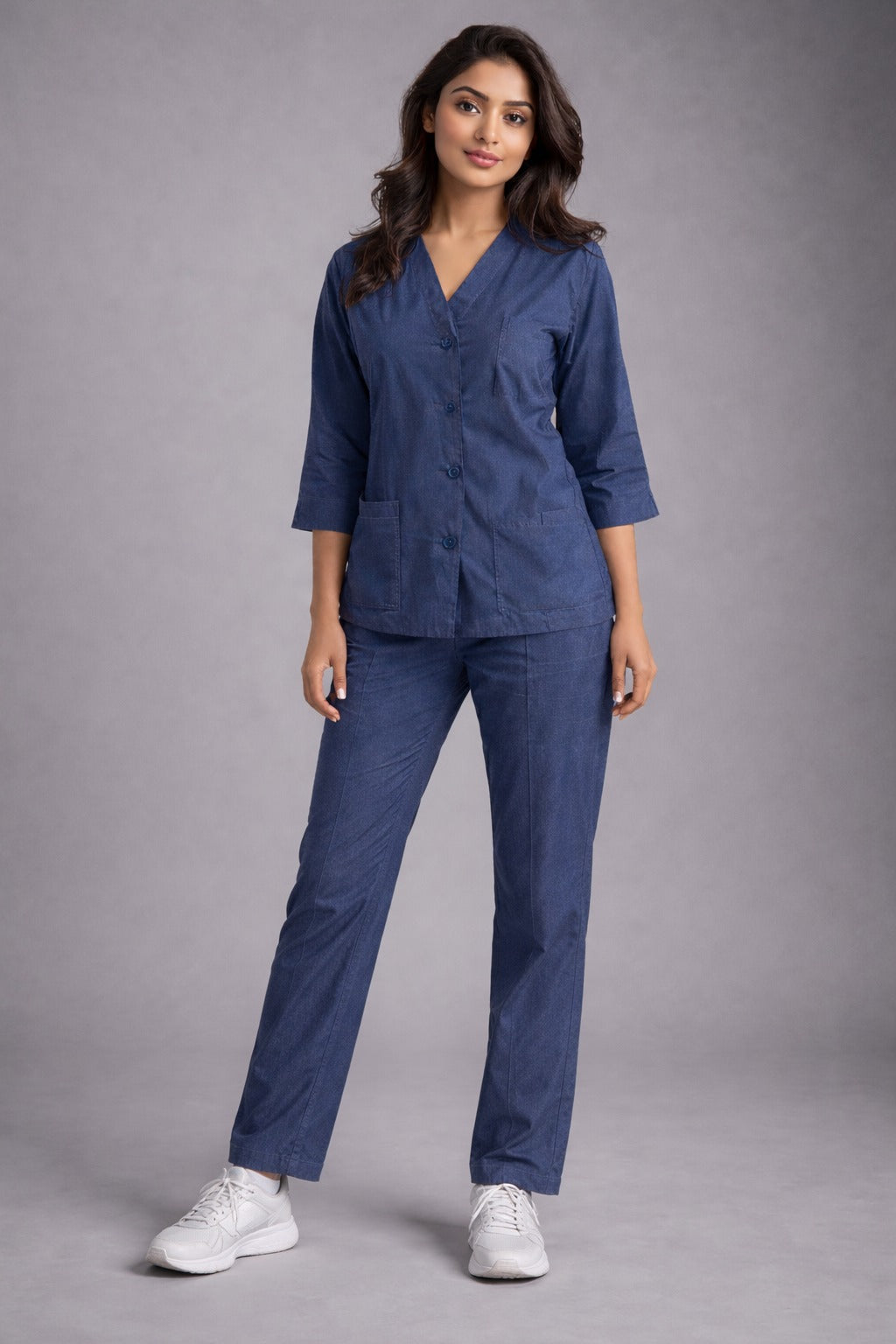 Elite Denim Blue Medical Scrub Set for Women – Comfortable | V-Neck Top & Touser | Soft Breathable Fabric, Professional Workwear | Sizes (XS-2XL)